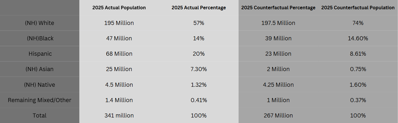 Had the Hart-Celler Act and 1986 Reagan Amnesty not been passed, our counterfactual data crunching shows that American demographics would have looked like this by 2025 (as compared to the 2025 actual data):