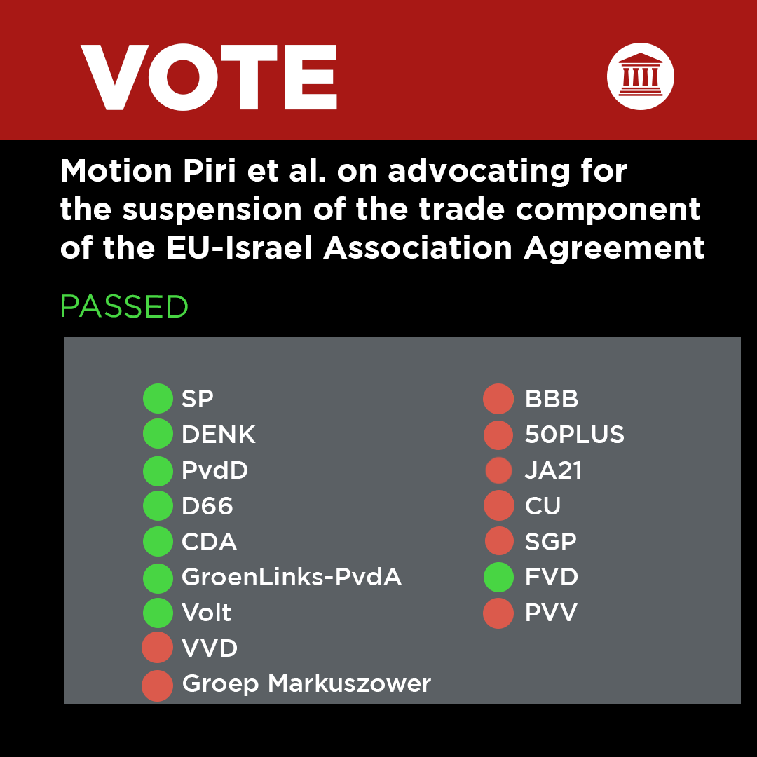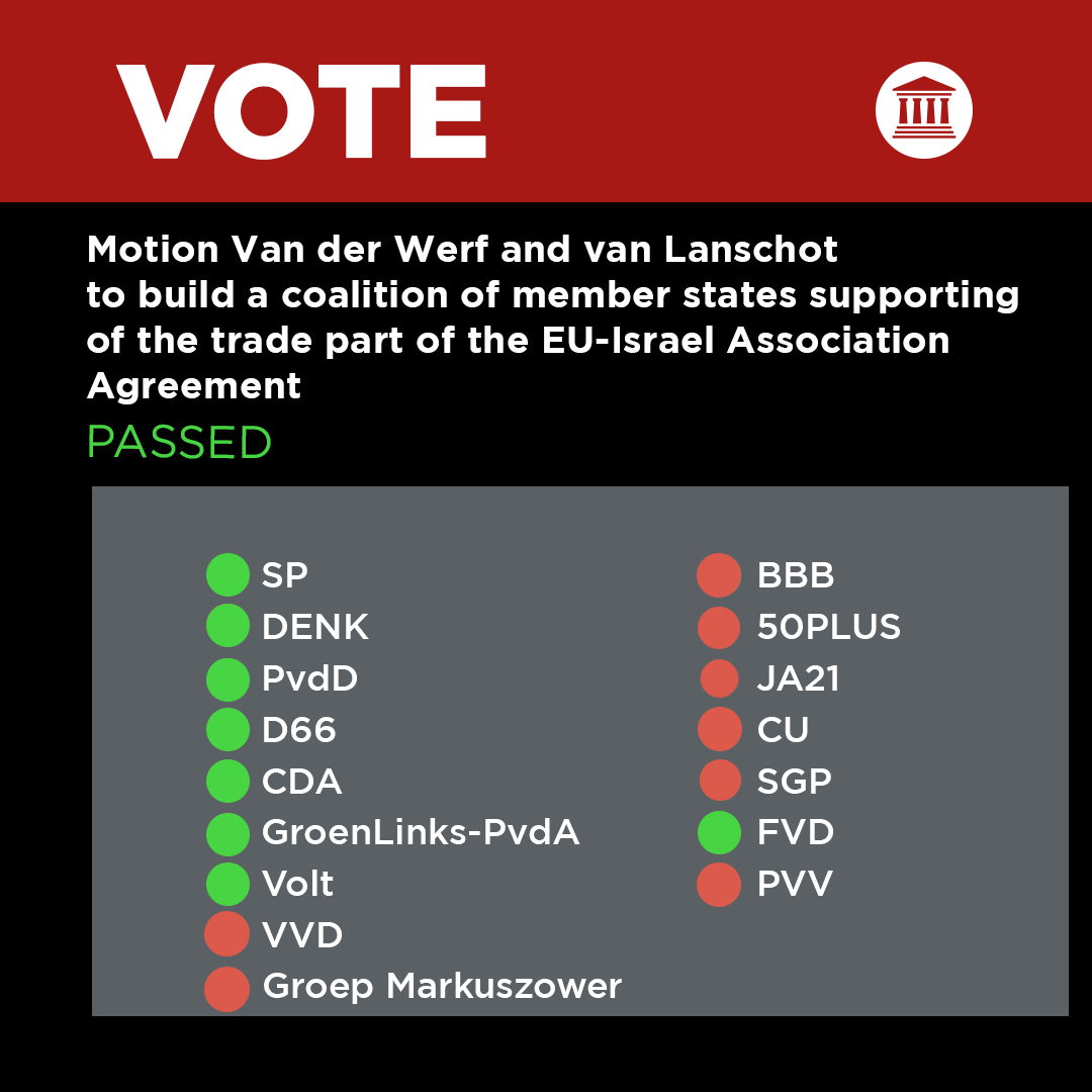 FVD has voted for two motions put down in Parliament, which garnered a majority and were therefore carried, calling for the trade component of the EU-Israel association agreement to be suspended. The motions provoked a sharp reaction from the Israeli ambassador to the Netherlands. Ambassador Vapni deplored as ‘shameful’ ‘a dangerous coalition between the radical left and the antisemitic extreme right’. This is pretty standard-issue Israeli boilerplate – but it is false. One of the two motions was put down by an MP from the governing centre-left D66 party, which sits with Renew in the European Parliament, and an MP from the governing centre-right Christiand CDA, which sits with the European People’s Party. Both motions were supported by these two parties. So the ‘dangerous coalition’ is not between the radical left and the extreme right but also includes two eminently respectable centrist parties who are currently in government. It is precisely not the extremes alone which are criticising Israel but instead now parties from across the political spectrum.