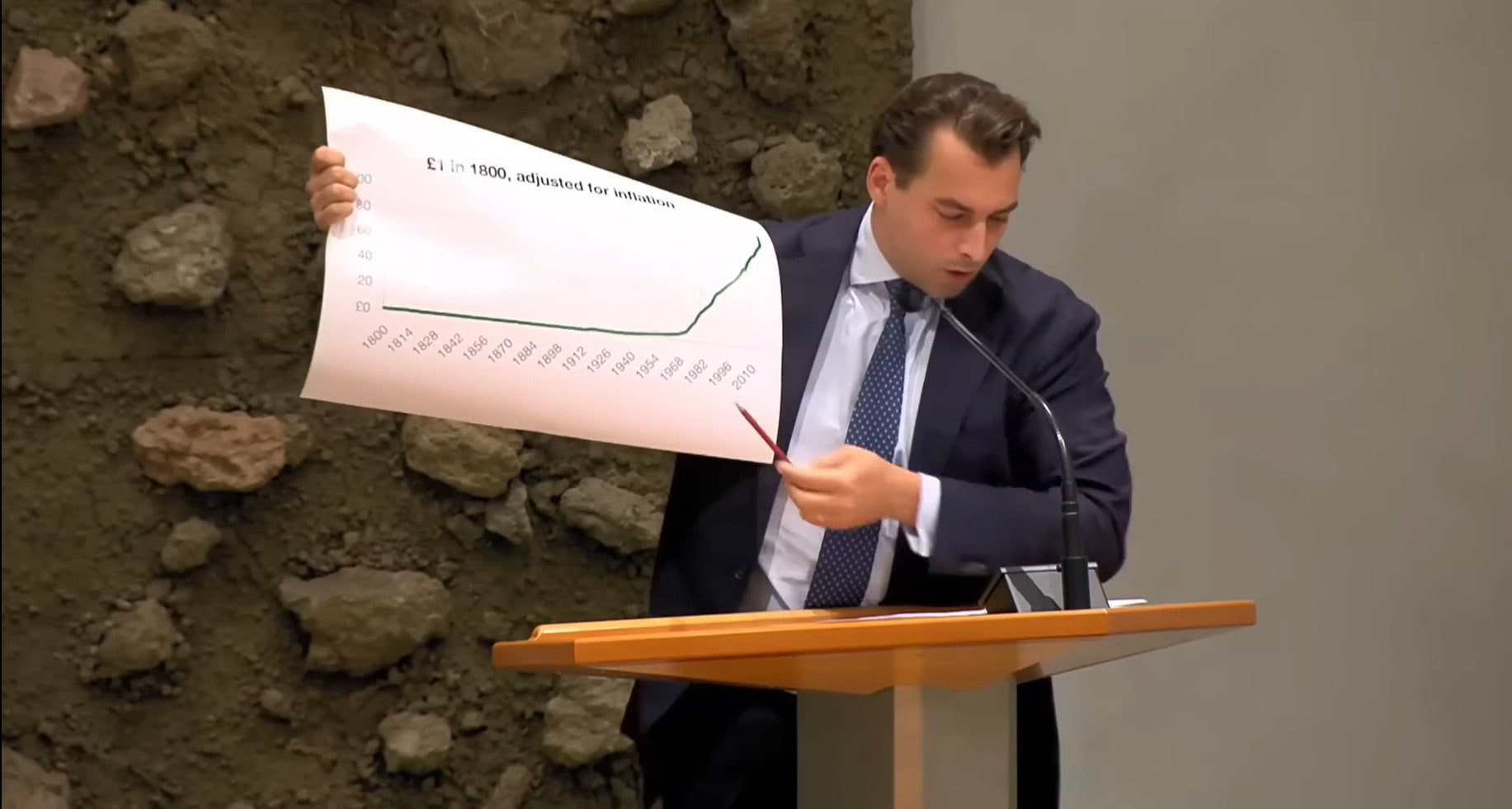 What could be more at the root of economics than money? FVD party leader Thierry Baudet surprised the Lower Chamber recently with a magisterial lecture about economics - and specifically about inflation and fiat money. These issues are never raised in European politics even though there is endless discussion about monetary policy and interest rates. Monetary creation is hardly ever mentioned – at least by politicians – as a cause of rising house prices and stock market booms. Yet there is nothing more fundamental than the ability to create money out of thin air. For more than 50 years, ever since the last definitive abandonment of the gold standard in 1971, this is what the world has been doing – with catastrophic consequences. The debt burden is now unbearable in many Western countries and will likely lead to even more inflation. Only FVD goes to the very root of the problems, instead of dancing around silly debates about how to implement or whether to delay this or that policy. Only FVD seeks to solve problems at their root, instead of attacking the symptoms like Geert Wilders’ Freedom Party which recently announced it intends to limit inflation by imposing price controls - a totally self-defeating Socialist fantasy.
